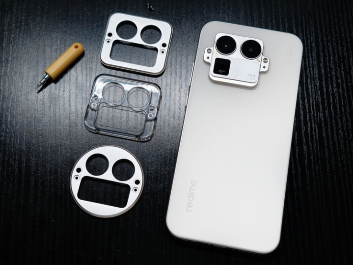 真我GT8Pro不仅在影像上突破,在设计上也带来了行业首创的机械拼装Deco设计。用户可通过“打开螺丝→换上新Deco→拧紧螺丝”三步,自由更换镜头模组外观。