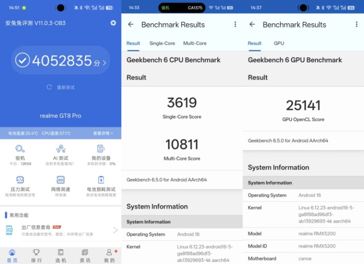 在安兔兔测试中,GT8Pro在室温环境能够轻松跑出405W分好成绩,GeekBench6单核性能3619分,多核性能更是来到了10811分,GPU分数更是来到了25141分。